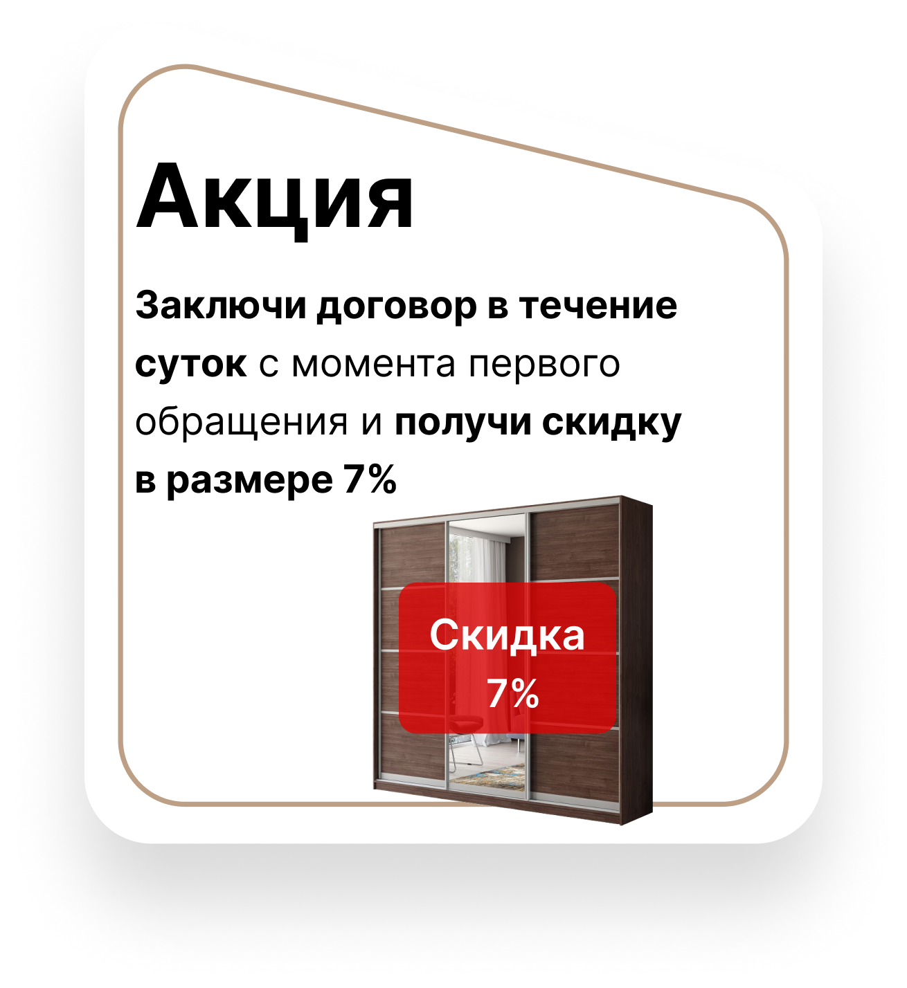 Благодаря тому, что у нас полный цикл производства распашных шкафов и шкафов-купе, нам удалось снизить сроки производства до 30 дней и установить выгодные для вас цены на продукцию.